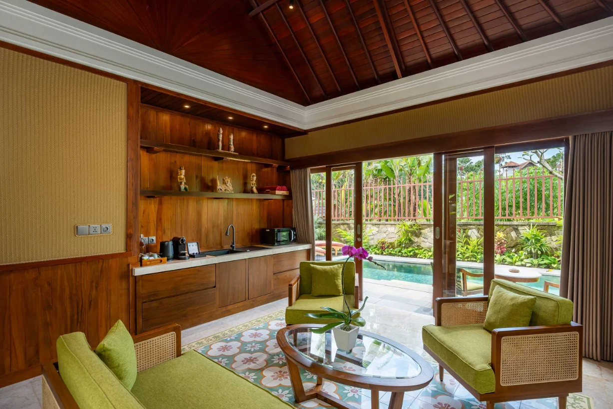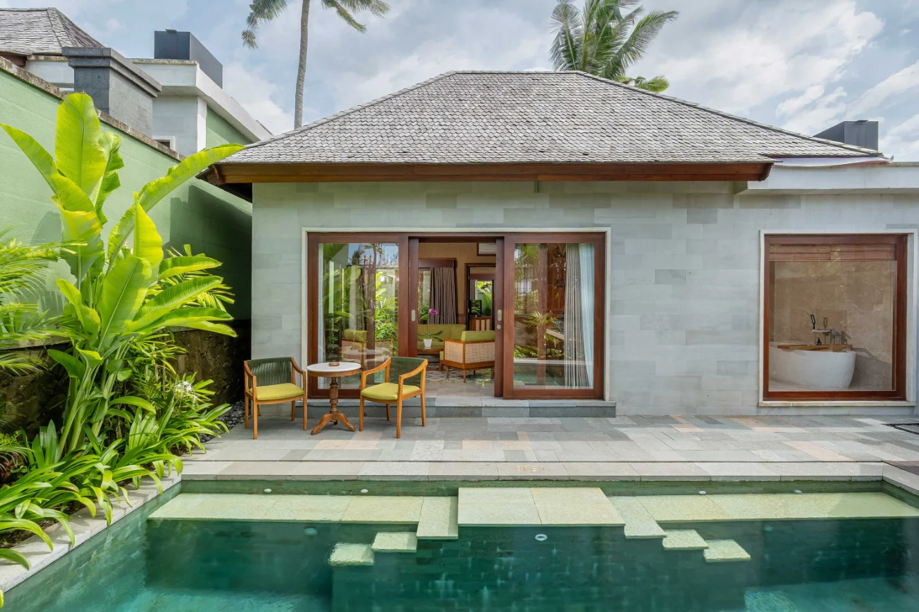 Surrounded by the enchanting beauty of Ubud’s landscapes, our One-Bedroom Pool Villa offers an expansive 180 sqm retreat with breathtaking rice field views, a private pool, and elegant living spaces, creating the perfect escape for honeymooners and couples. With a seamless blend of Balinese charm and modern luxury, this villa provides an intimate and rejuvenating retreat.