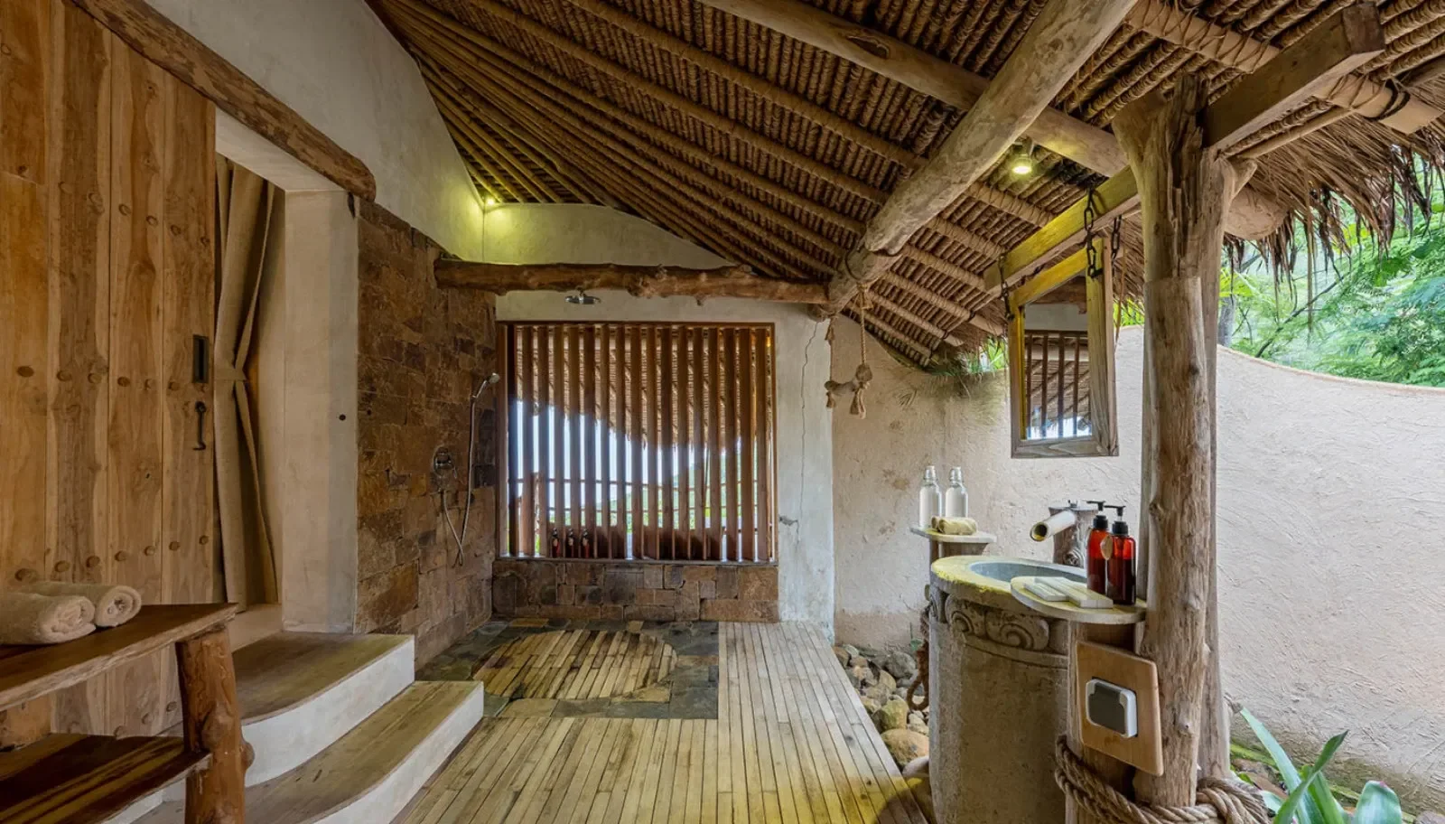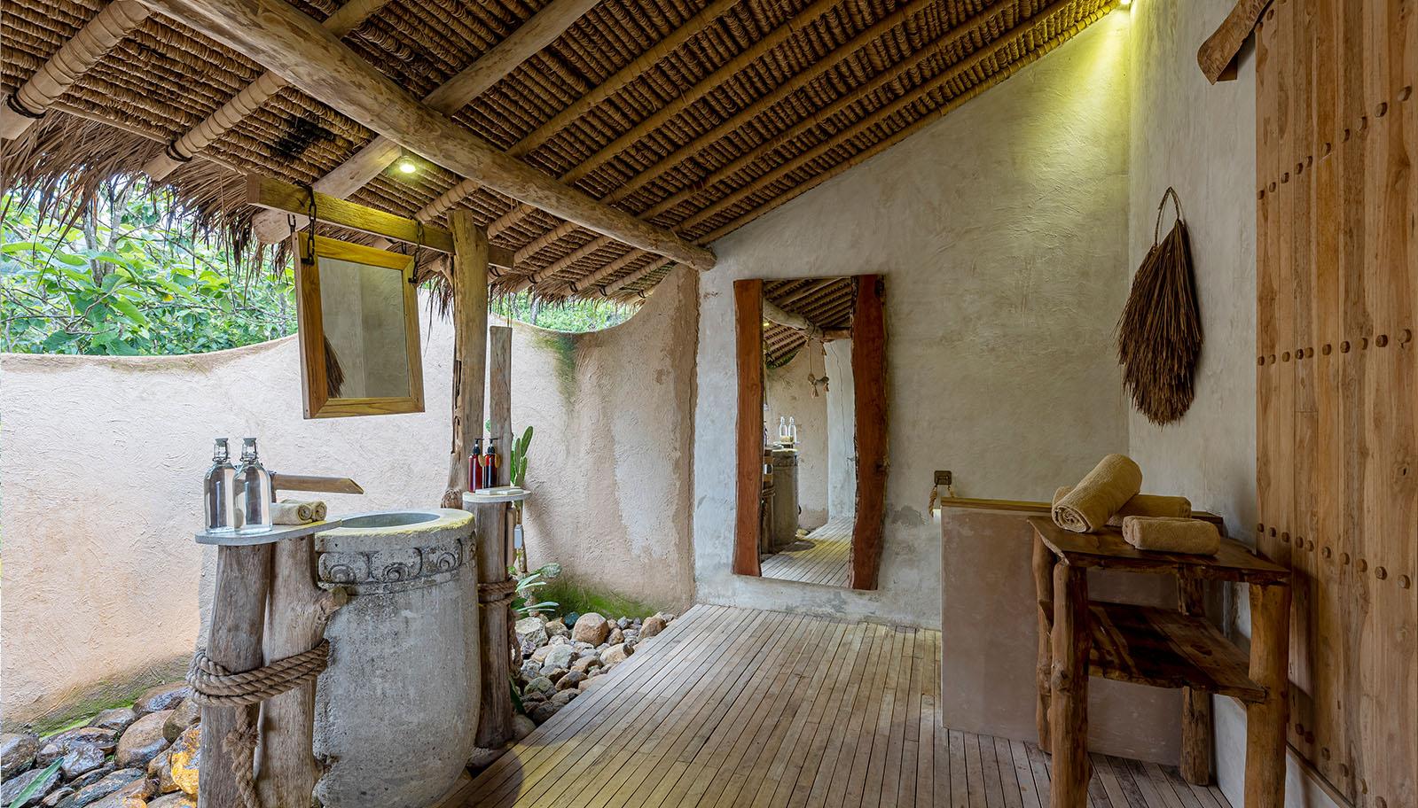 The spacious semi-outdoor bathroom is perfect for parents and children, with an atmosphere that harmoniously blends stone and wood elements. A door in the dressing area leads to a second bedroom that features a pair of twin beds for children, air conditioning and a window that overlooks the blue ocean.