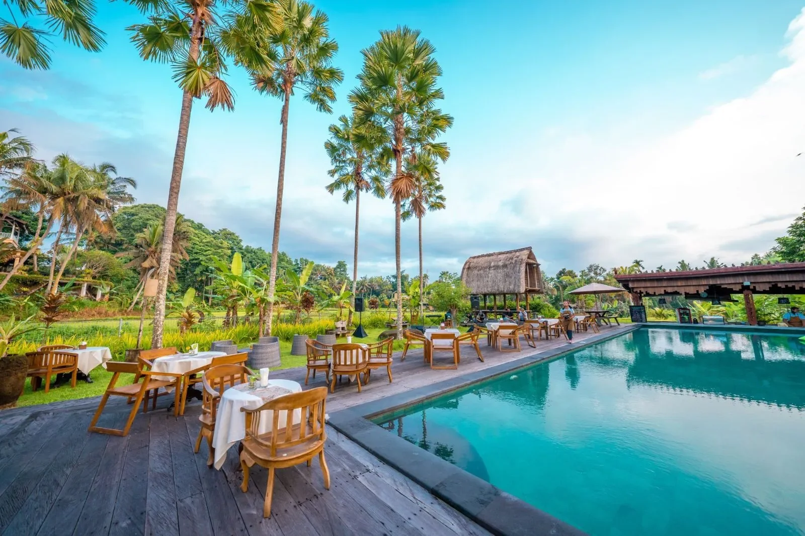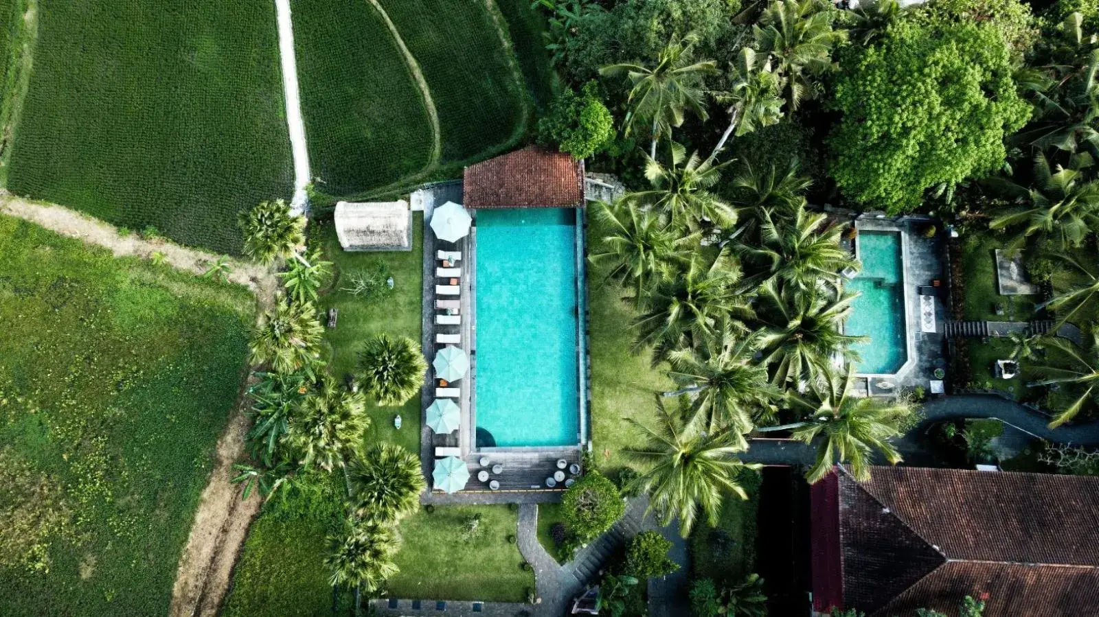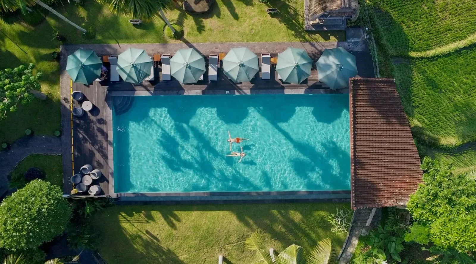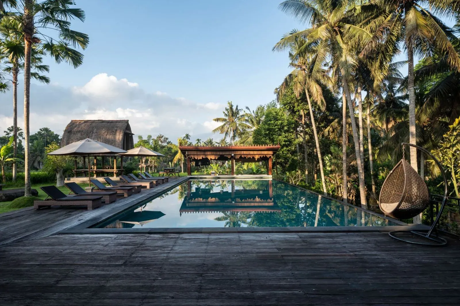 The Artini Dijiwa Ubud features not one, but two stunning swimming pools. The main swimming pool is bordered by lofty coconut trees, a wooden pool deck, and beautifully manicured lawns that merge into working rice paddies. At the corner of the main pool there is an open-sided bale with a thatched roof overlooking the rice fields that is perfect for afternoon tea or curling up in with a good book. The smaller pool overlooks the garden and has a bubbling water fountain that streams into the pool.